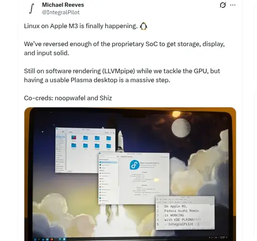 The initial Apple M3 hardware debuted back in 2023 while the Asahi Linux bring-up has been slow given engineering changes that have also carried on to the newer M4 and M5 hardware too. Paired with the reduced volunteer manpower, it’s been a slow process being able to enjoy Linux on newer Apple Macs. Asahi Linux developer Michael Reeves shared some progress though this week on the porting to the M3 hardware.